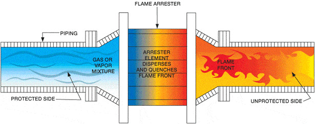 Flame arrester thường được lắp trên các đường ống chứa khí hoặc hơi của các chất dễ cháy như hydrocarbon, diesel. Chất lưu thường đi qua flame arrester trước khi đến bird screen ở cuối đường ống. Mục đích chính của flame arrester là:
