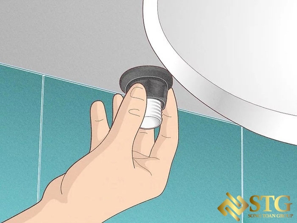 Sử dụng keo silicon hoặc xi măng trắng để dán dưới mặt bích. Đặt thân ống dẫn dưới bồn rửa, đảm bảo rằng lỗ trục được đặt ở phía sau và vặn bích từ phía trên.