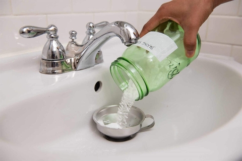 - Trộn baking soda và giấm, đổ vào đường cống để tạo phản ứng phát sủi giúp làm mềm chất thải.