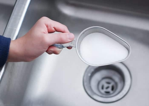 - Rót một cốc baking soda vào cống, sau đó đổ nước nóng vào.