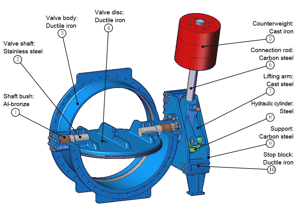 Còn gọi là van một chiều quả cân thủy lực, có đòn bẩy đối trọng giúp vận hành dễ dàng hơn.