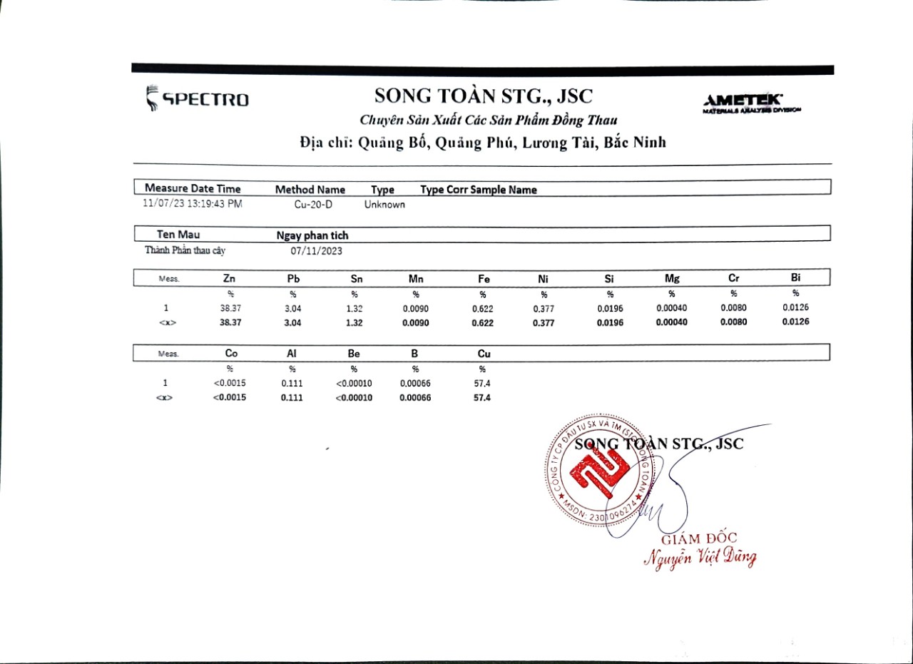 Bản test đồng thau tại Song Toàn (STG)., JSC