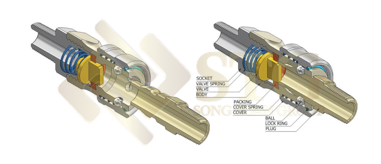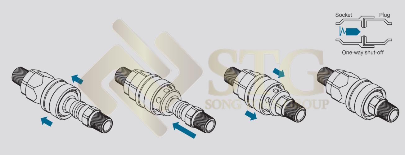 - Bộ ghép nối có tính năng bật-tắt một chiều với van tự động tích hợp vào lỗ, giúp kiểm soát dòng chất lỏng hiệu quả.