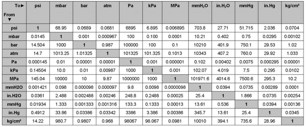 Các cảm biến / đồng hồ áp suất thường sử dụng nhiều đơn vị khác nhau như bar, Kg/cm2, Psi, Kpa, Mpa, Pa. Mỗi đơn vị này có thể được chuyển đổi sang đơn vị khác một cách tương đương. Tùy thuộc vào khu vực, một số đơn vị được ưa chuộng hơn.