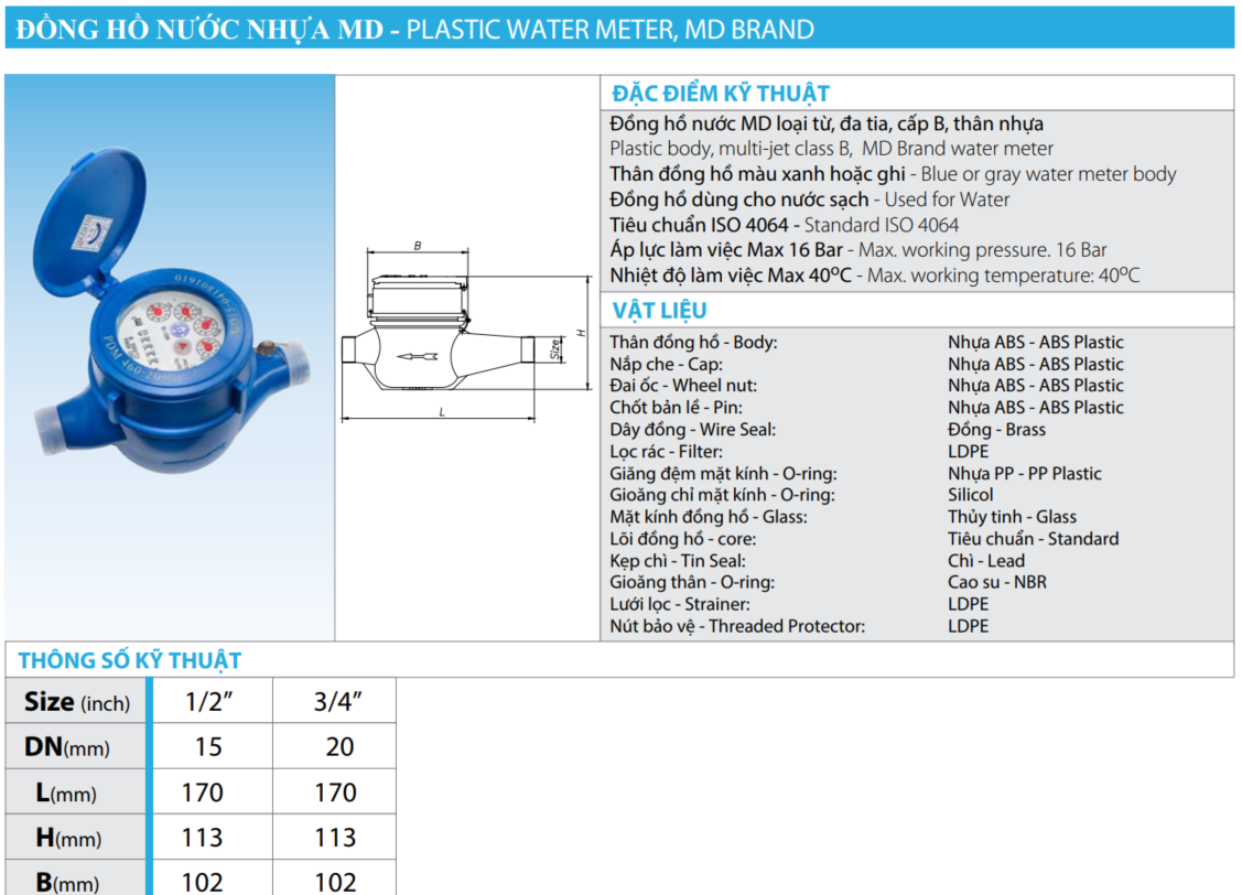 - Tiêu chuẩn sản xuất: ISO 4064.