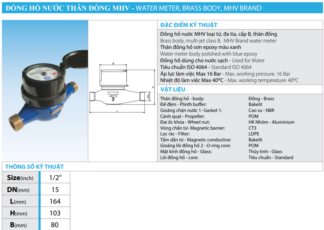 - Tiêu chuẩn sản xuất: ISO 4064.
