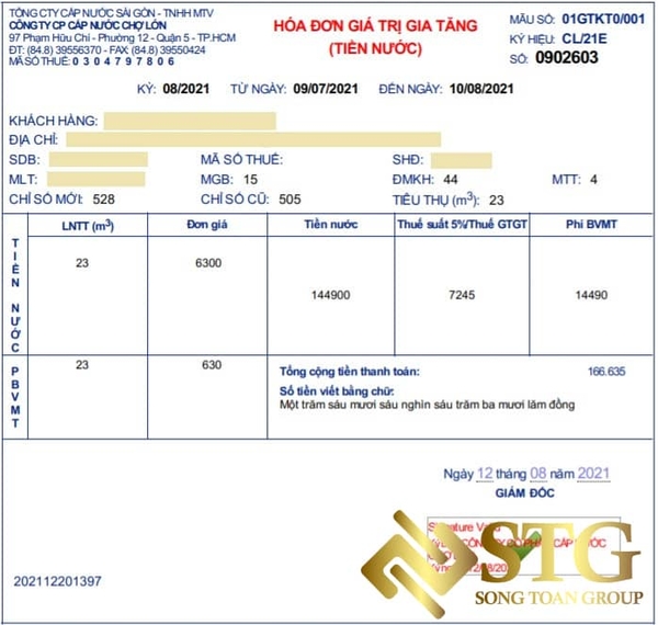 Số Tiền Thanh Toán = Lượng Nước Tiêu Thụ (m³) × Đơn Giá Hiện Hành + Thuế Suất GTGT (5%) + Phí Bảo Vệ Môi Trường (10%)