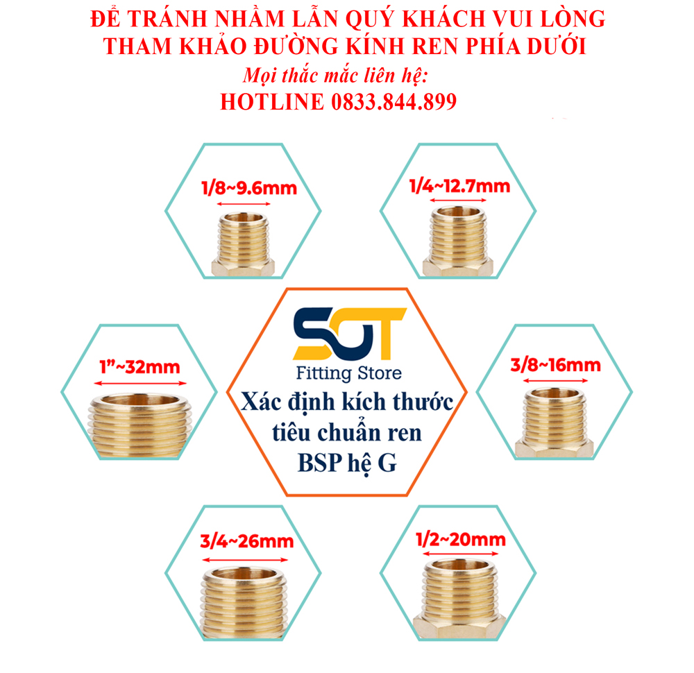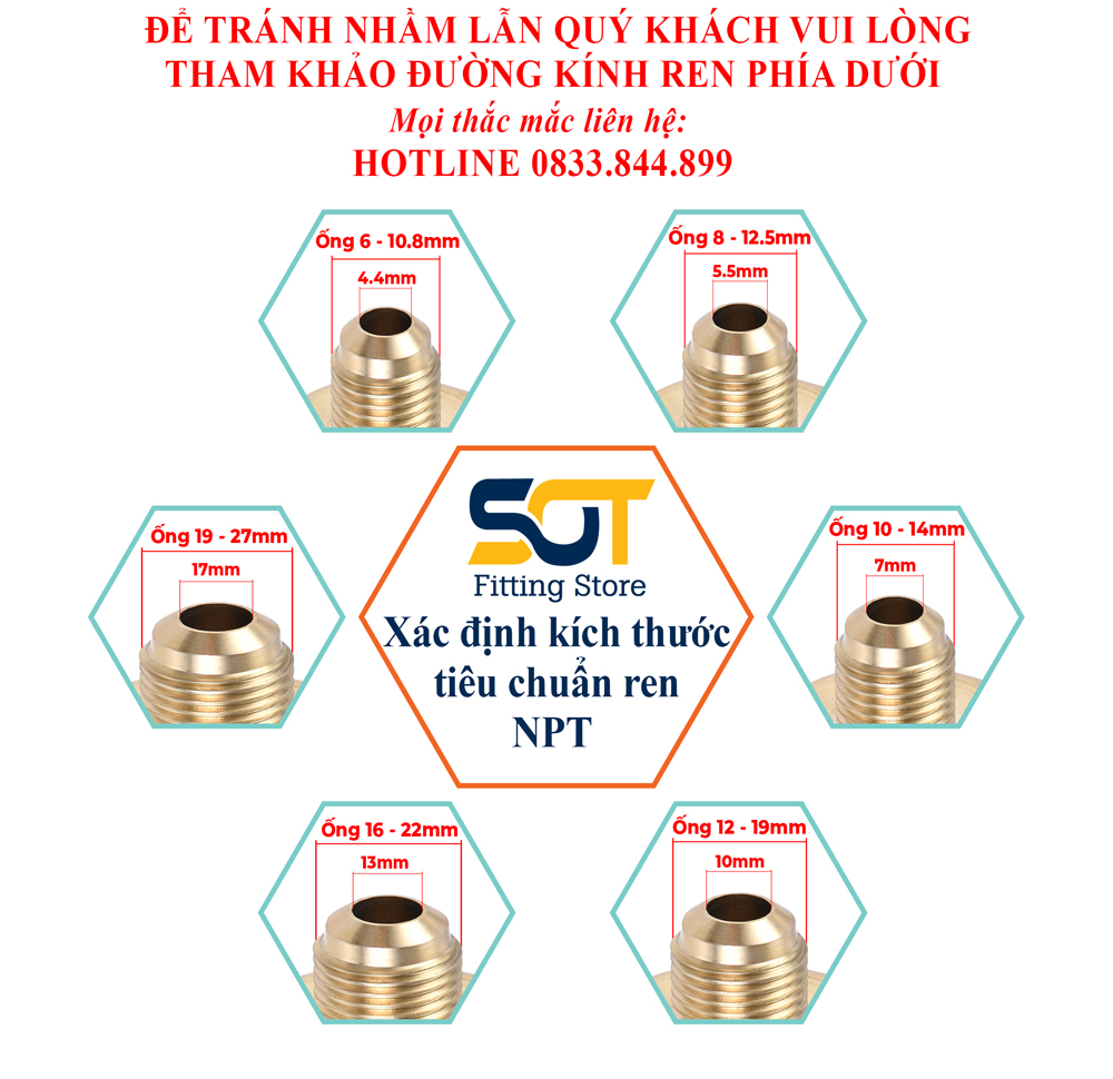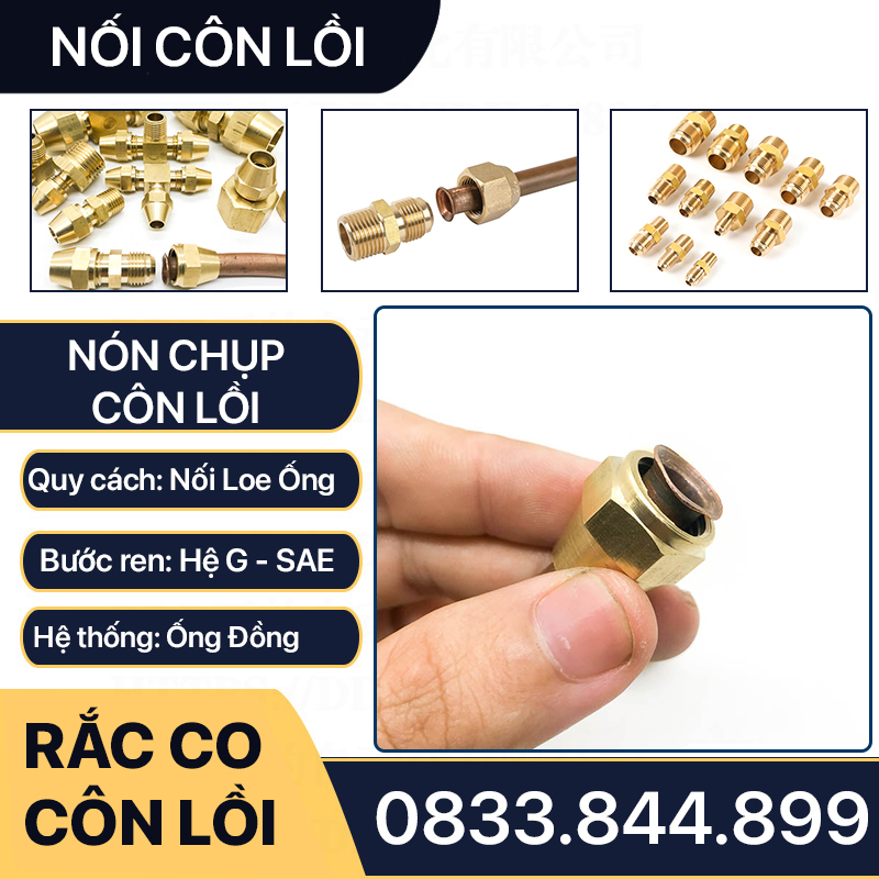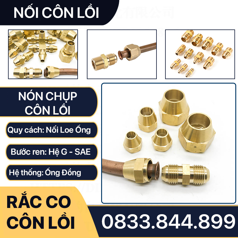 Rắc co côn lắp ống đồng: Phi 6.35, Phi 8mm, Phi 9.52mm, Phi 12.7mm, Phi 15.88mm, 19mm
