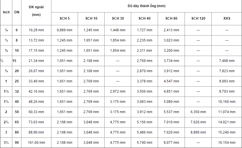 SCH80: Độ dày cao, chịu áp lực lớn, thường được sử dụng trong các hệ thống cần độ bền cao.