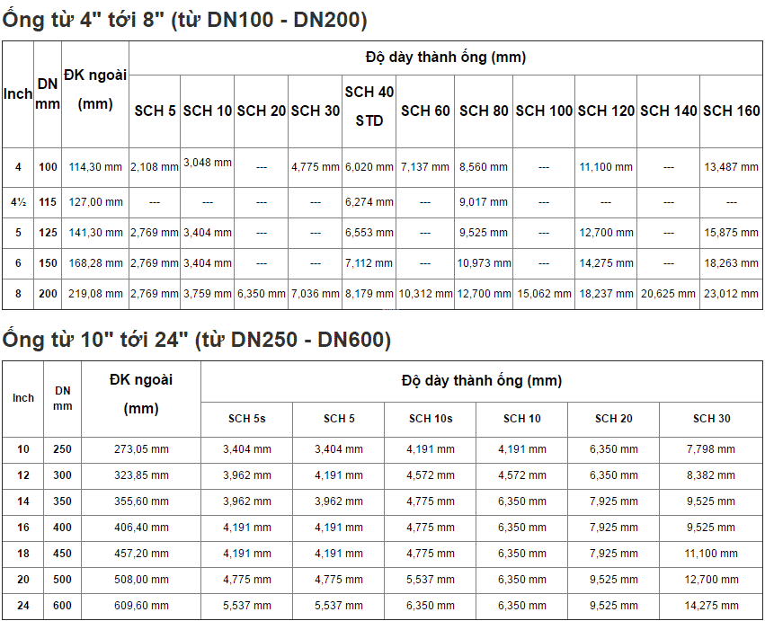 SCH100: Độ dày rất cao, dùng trong các ứng dụng đặc biệt, yêu cầu khả năng chịu áp suất lớn.