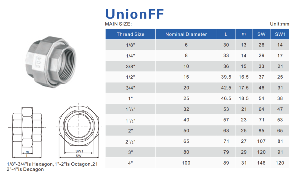 Tên sản phẩm: Rắc co ren trong Inox 304, Đầu nối rắc co ren trong Inox 304, Hai ren trong Inox 304, Nối ren rắc co Inox 304.