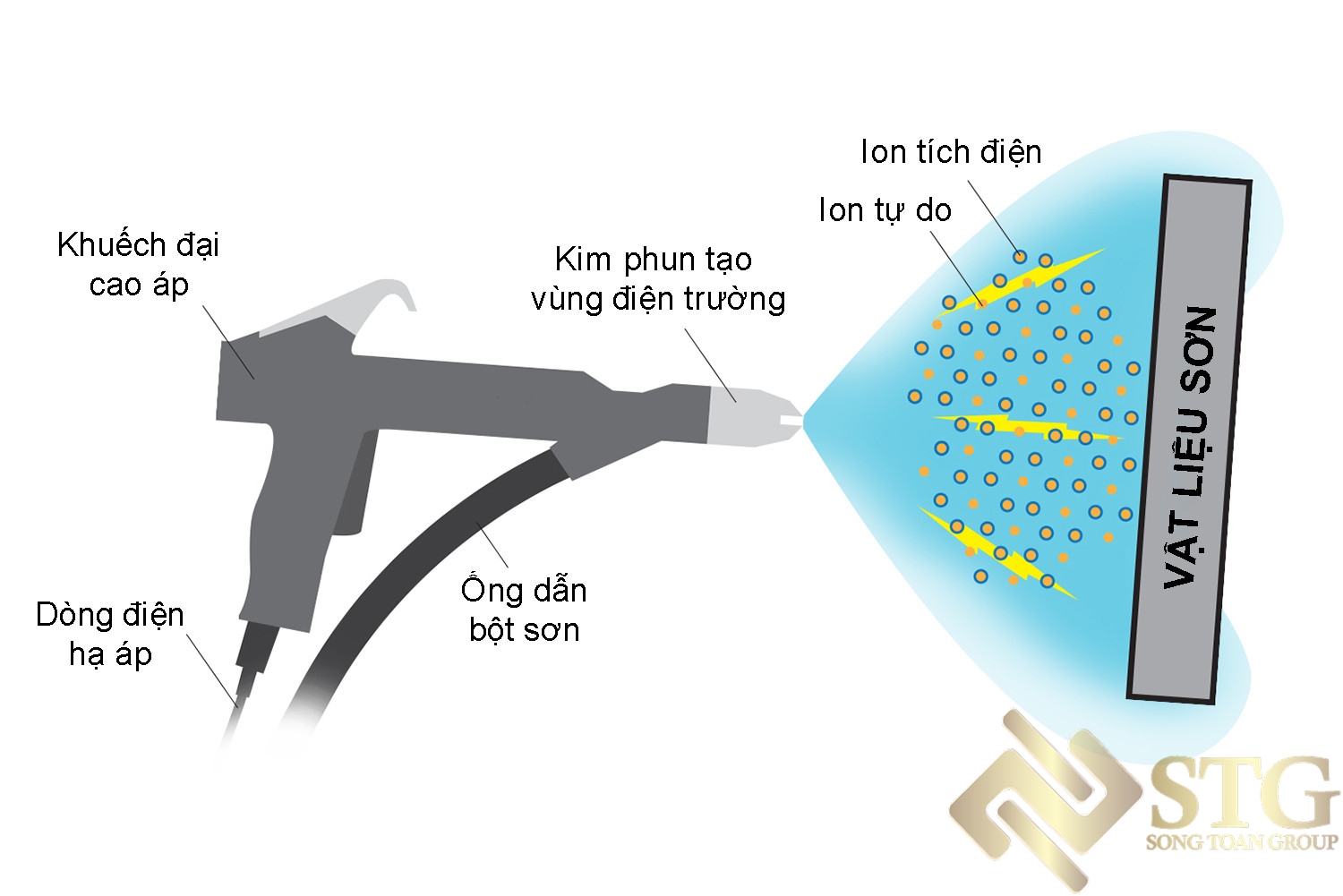 Tích điện bột sơn: Bột sơn được tích điện để có điện tích dương, sau đó được phun lên vật liệu cần phủ, mà đã được tích điện âm. Sự hút tĩnh điện giữa hai điện tích trái dấu này tạo ra liên kết ion, cung cấp độ bám dính cao và độ bền tốt.