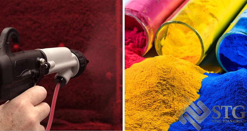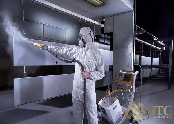 Bột sơn tĩnh điện được đưa qua súng phun tĩnh điện, nơi nó sẽ được đun nóng và tích điện dương tại đầu kim phun.