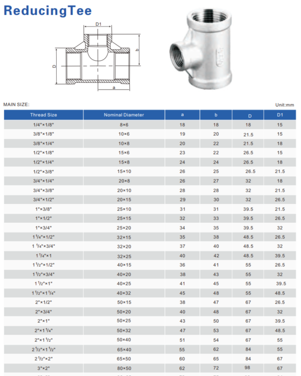 Tên sản phẩm: Tê giảm ren Inox 304, đầu nối tê giảm ren Inox 304, tê thu ren trong Inox 304