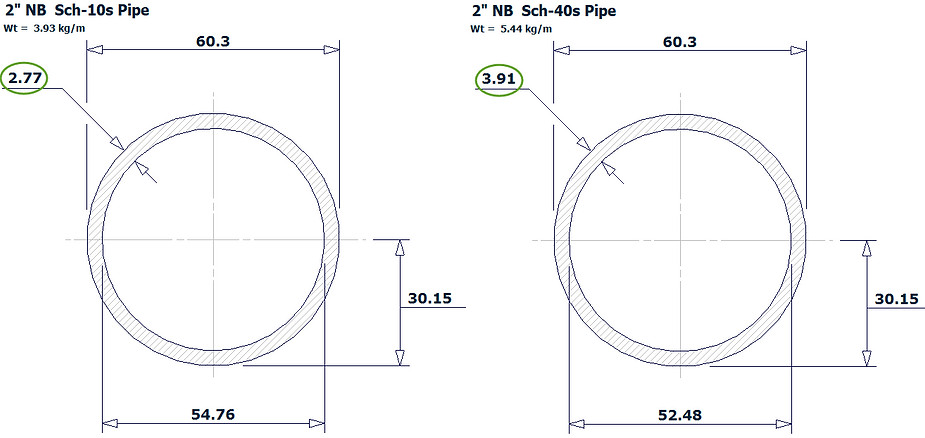 Nếu hai ống có cùng đường kính ngoài (Nominal pipe size - DN) nhưng khác nhau về schedule hoặc độ dày, điều này chỉ ra rằng chúng có cùng đường kính ngoài, nhưng khác nhau về đường kính trong (Nominal diameter - DN).
