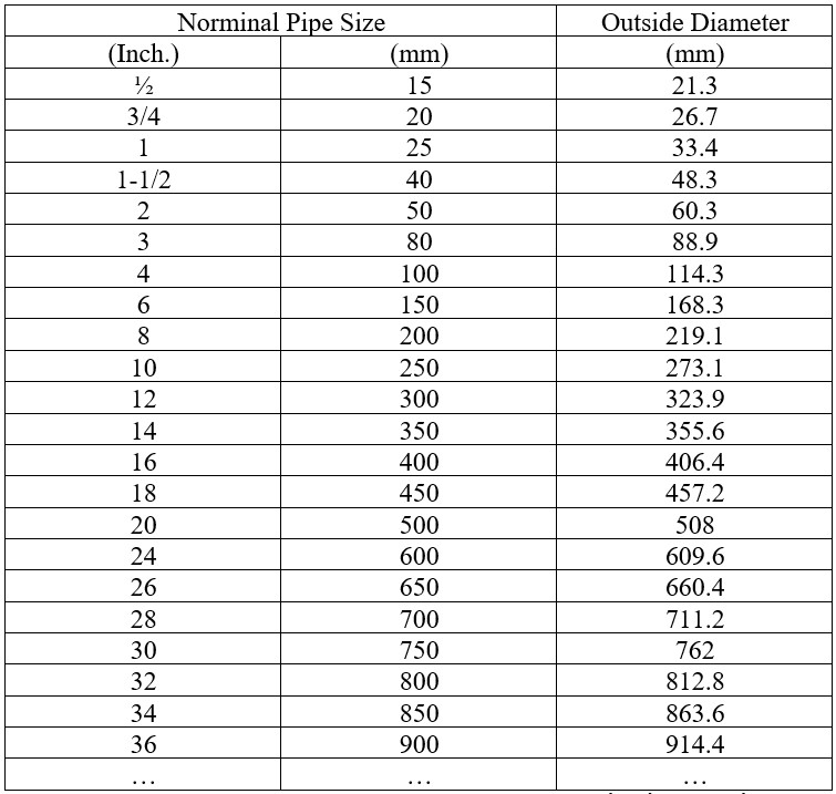 Ví Dụ: Đối với ống có NPS là 10", đường kính ngoài có thể là bất kỳ giá trị nào khác 254mm (10x25.4).