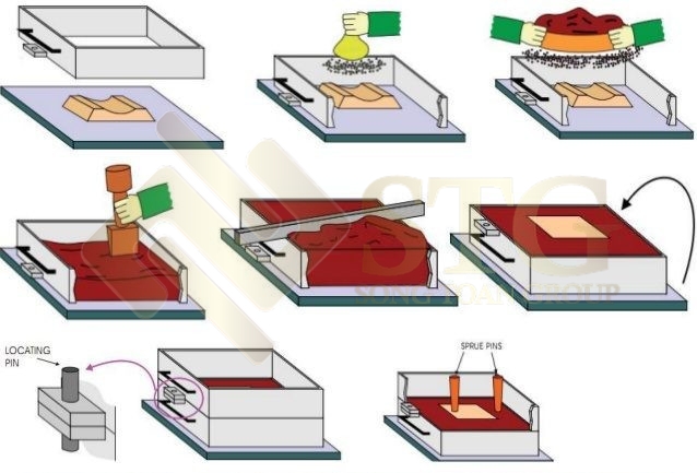 - Định nghĩa: Phương pháp đúc trong khuôn cát là một quy trình đúc kim loại sử dụng khuôn được làm bằng hỗn hợp cát silic, chất kết dính, chất phụ, và chất sơn khuôn. Khuôn này chỉ được sử dụng một lần.