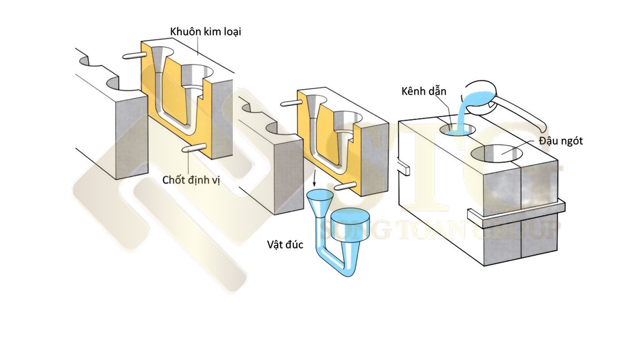 - Vật liệu kim loại được nung nóng và rót vào khuôn kim loại.