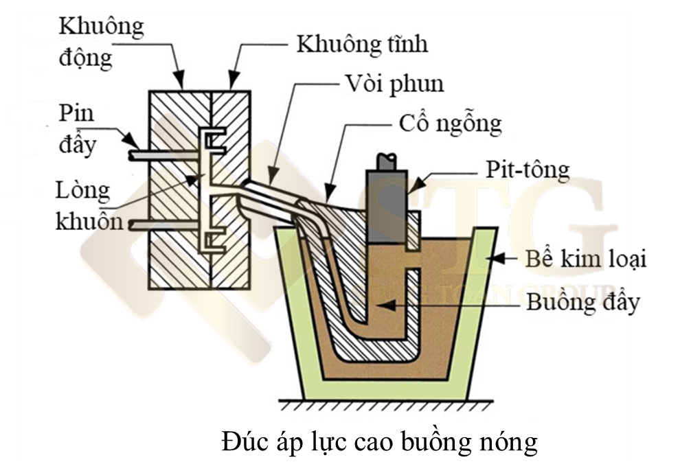 - Định Nghĩa: Phương pháp này sử dụng áp lực cao của piston để ép kim loại trong buồng vào long khuôn kim loại. Quá trình đúc này được thực hiện nhanh chóng và có thể chia thành hai loại chính: máy đúc buồng nóng và máy đúc buồng lạnh.