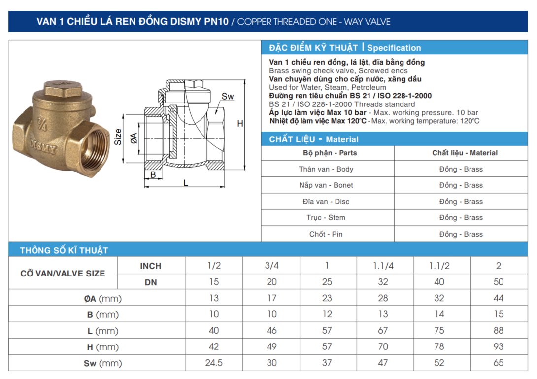 Van một chiều lá ren đồng DISMY PN10 thuộc thương hiệu là DISMY® là sản phẩm chất lượng cao, được thiết kế đặc biệt để ngăn chặn dòng chảy ngược trong các hệ thống cấp nước, hơi, và dầu. Với thiết kế ren tiêu chuẩn BS 21 / ISO 228-1:2000, van một chiều này không chỉ dễ lắp đặt mà còn đảm bảo độ bền vượt trội.