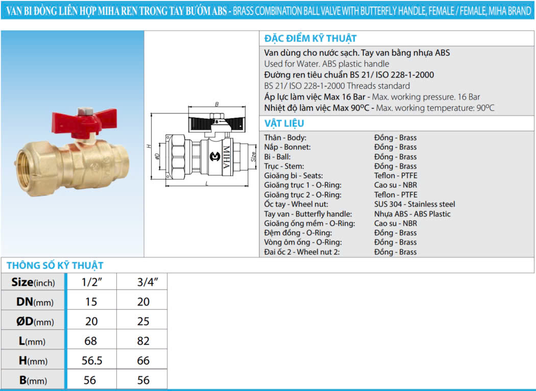 Van bi đồng liên hợp MIHA ren trong tay bướm ABS là sản phẩm được thiết kế chuyên dụng cho hệ thống nước sạch. Với thiết kế ren trong linh hoạt và tay bướm ABS bền bỉ, van bi MIHA mang đến sự tiện lợi và hiệu quả vận hành tối ưu.
