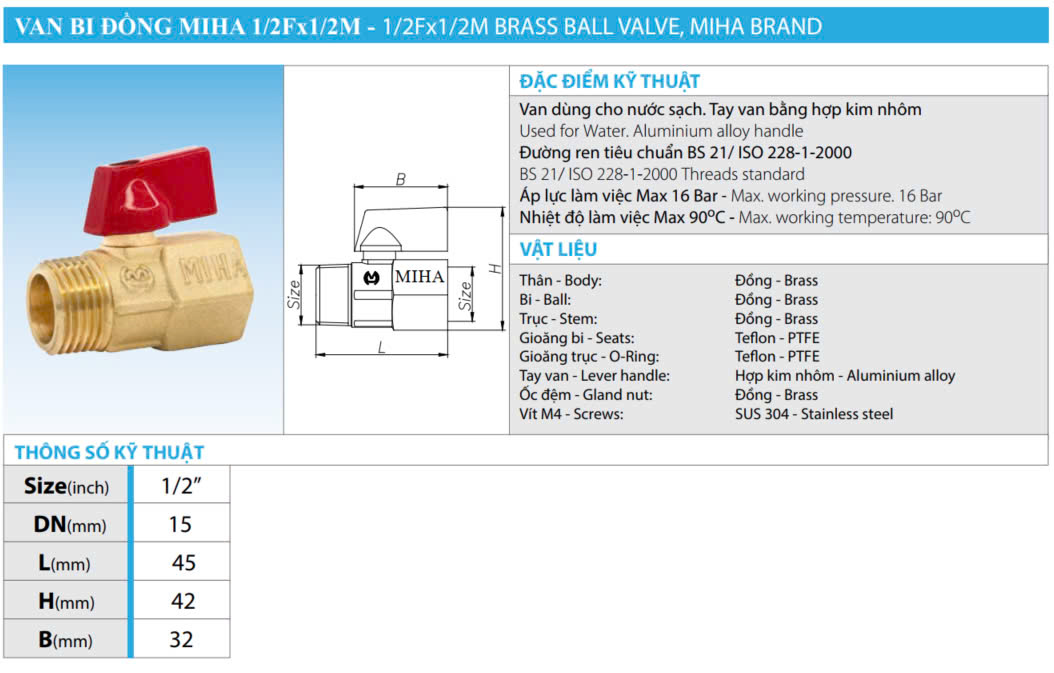 Van bi đồng MIHA 1/2Fx1/2M là sản phẩm cao cấp, được thiết kế đặc biệt để đáp ứng các yêu cầu của hệ thống nước sạch. Với tay gạt hợp kim nhôm chắc chắn và độ bền cao, sản phẩm mang lại hiệu quả sử dụng vượt trội.