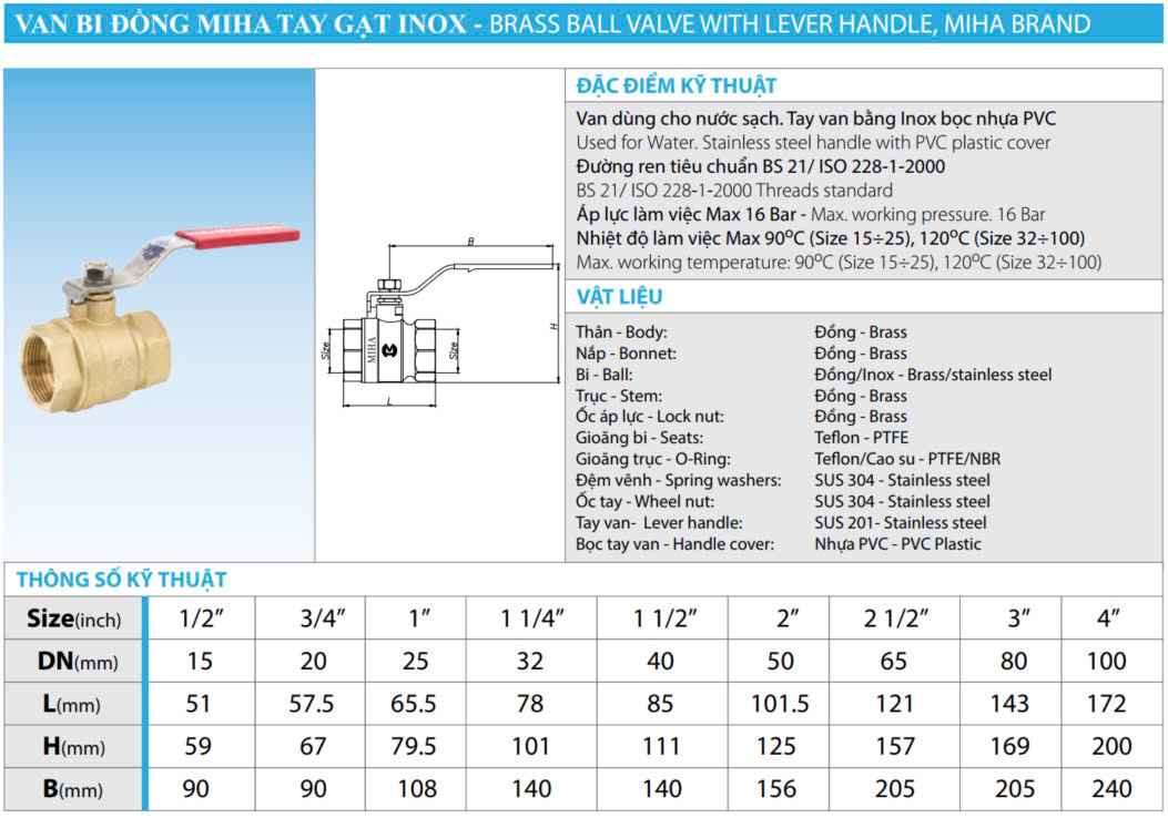 - Bi van: Đồng/Inox - chịu lực tốt, đảm bảo độ kín khít.