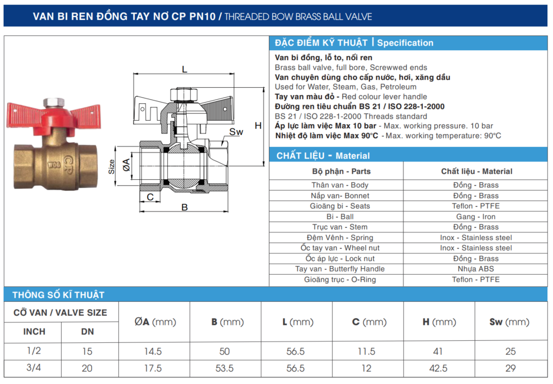 Van bi ren đồng tay nơ CP PN10 thuộc thương hiệu là DISMY® là sản phẩm cao cấp, được thiết kế để đáp ứng nhu cầu sử dụng trong các hệ thống cấp nước, hơi, xăng dầu và khí. Với thiết kế ren tiêu chuẩn BS 21 / ISO 228-1:2000, van bi này không chỉ dễ dàng lắp đặt mà còn đảm bảo độ bền và hiệu suất vượt trội.
