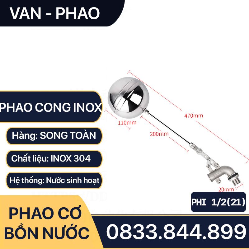 Tên sản phẩm: Phao bồn nước inox, Van phao bồn nước inox 304, Phao ngắt bồn nước Inox 304 Phi 21, Phao cong inox