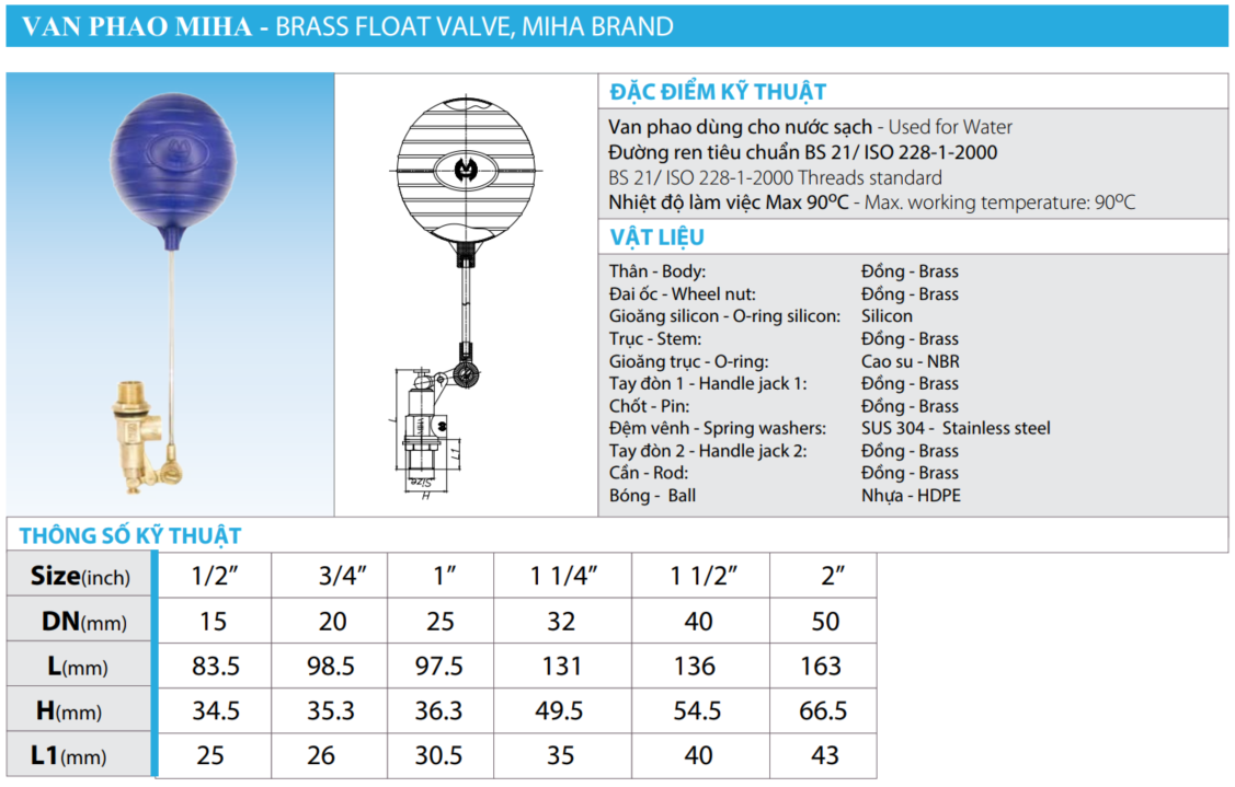 | Kích thước (inch) | DN (mm) | Chiều dài (L mm) | Chiều cao (H mm) | Chiều dài cán phao (L1 mm) |