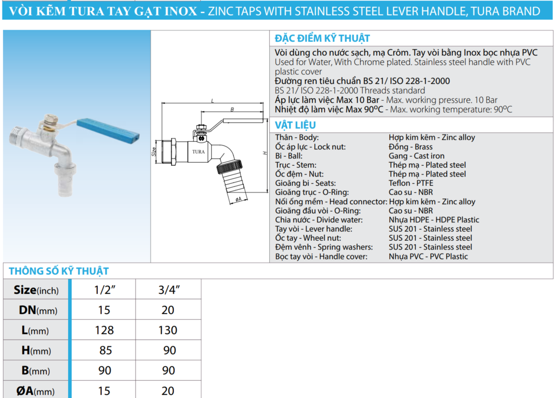 Vòi Kẽm TURA Tay Gạt Inox - Sản Phẩm Đáng Tin Cậy Cho Hệ Thống Nước