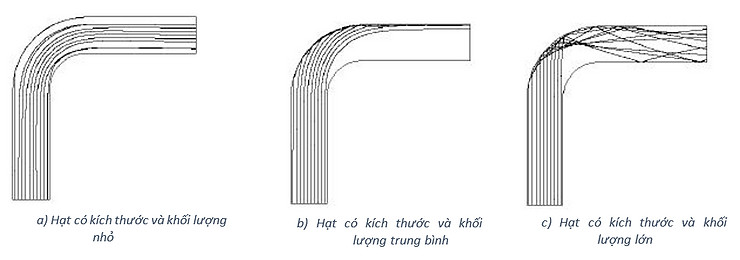 Hình 2: Mô tả đường di chuyển của các hạt có kích thước và khối lượng khác nhau qua elbow