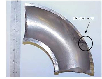 Hình 3 mô tả các vùng có thể xảy ra xói mòn bên trong elbow. Chúng ta thấy rằng, khu vực chính bị xói mòn là nơi lưu chất thay đổi hướng. Ngoài ra, còn tồn tại một số vùng xói mòn thứ cấp xảy ra do lưu chất chảy rối sau đó. Xói mòn ở elbow có thể gây ra tổn thất kinh tế lớn vì phải thường xuyên thay thế elbow.